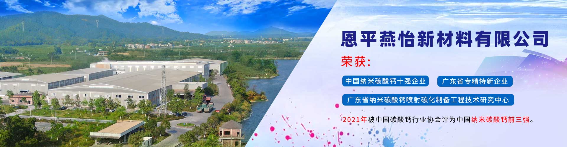 恩平燕怡新材料有限公司成立于2006年,位于廣東省江門恩平市。是一家專注于納米碳酸鈣產品研發、生產以及銷售服務的新材料企業。 公司榮獲 “高新技術企業”、 “清潔生產企業”、“廣東省納米碳酸鈣噴射碳化制備工程技術研究中心” 、 “中國納米碳酸鈣十強企業” 、 “廣東省專精特新企業”等稱號,并通過ISO9001:2015質量管理體系認證,產品質量符合國家行業標準GB/T19590—2011納米碳酸鈣優等品的要求。...